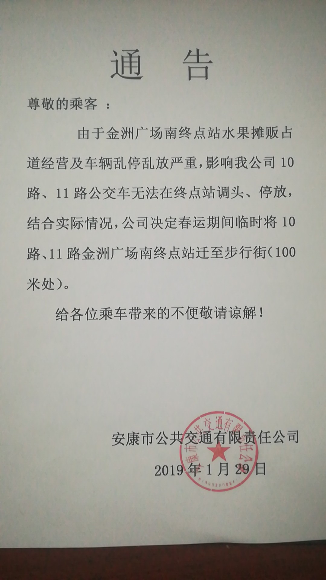 由于金洲廣場(chǎng)南終點(diǎn)站水果攤販占道經(jīng)營(yíng)及車輛亂停亂放嚴(yán)重,影響我公司10路、11路公交車無(wú)法在終點(diǎn)站調(diào)頭、停放,結(jié)合實(shí)際情況,公司決定春運(yùn)期間臨時(shí)將10路、11路金洲廣場(chǎng)南終點(diǎn)站遷至步行街(100米處)。